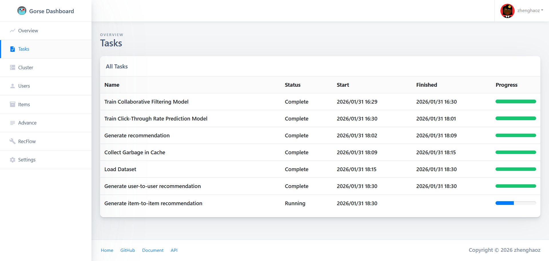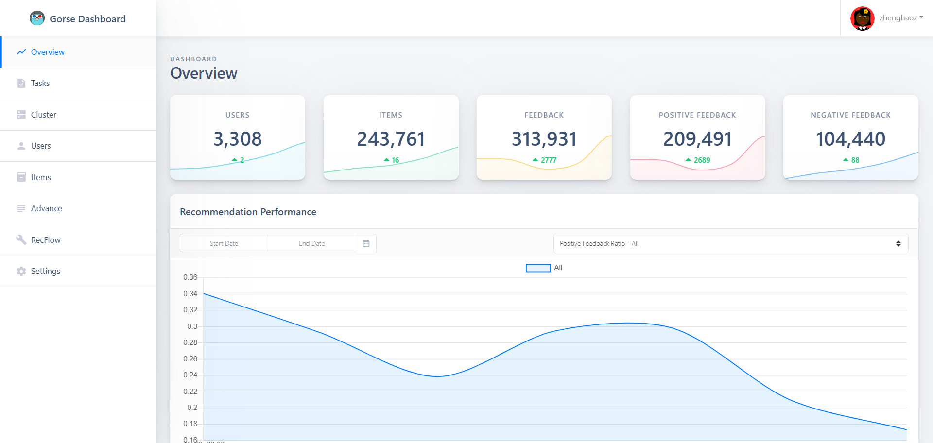 docker run -p 8088:8088 zhenghaoz/gorse-in-one --playgroundThe playground mode will download data from GitRec and import it into Gorse. The dashboard is available at http://localhost:8088.